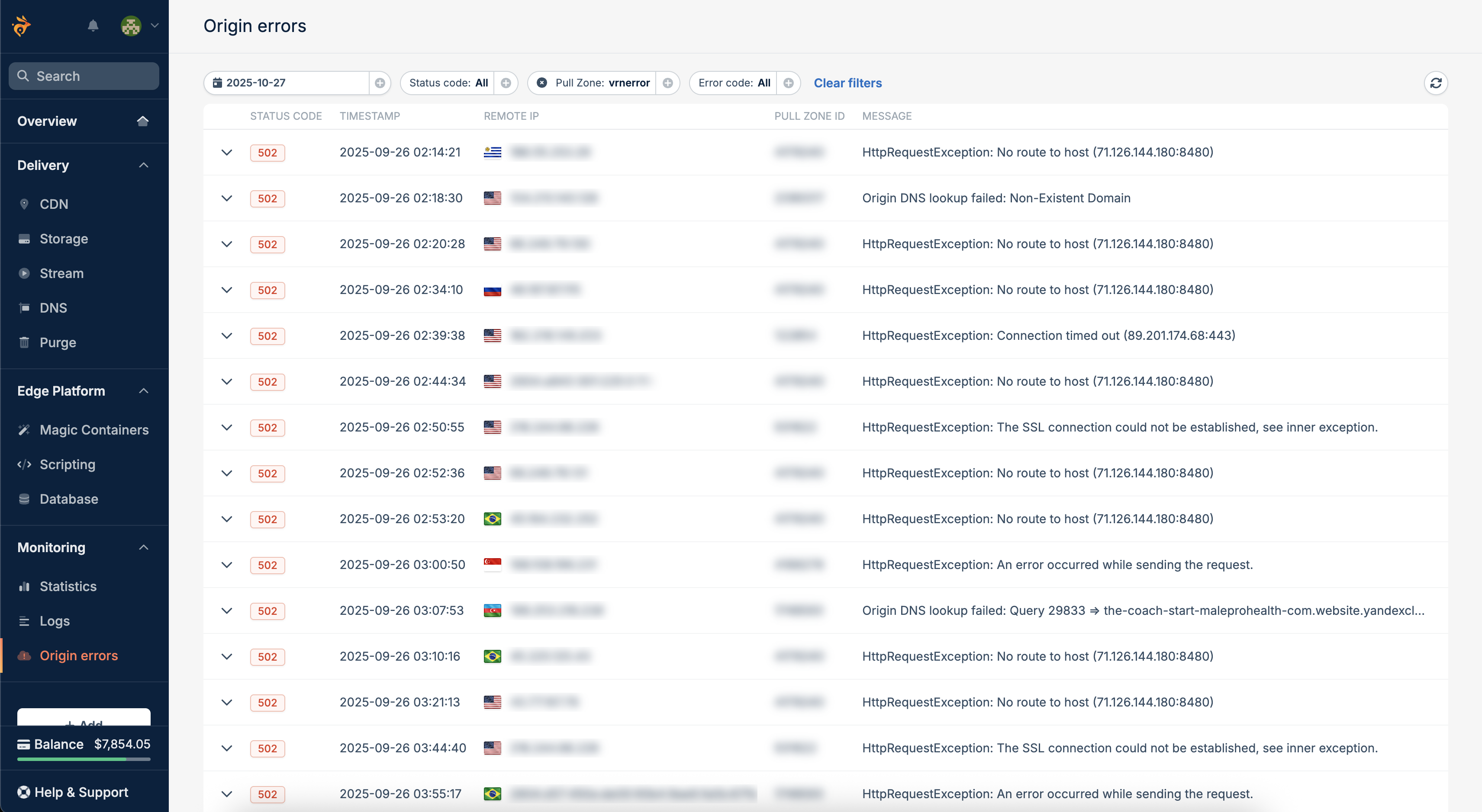 Browse and filter origin errors under Monitoring → Origin Errors to quickly identify where and why failures occurred. Each entry includes timestamp, edge region, pull zone ID, error type, and status code, helping you isolate the issue instantly.
