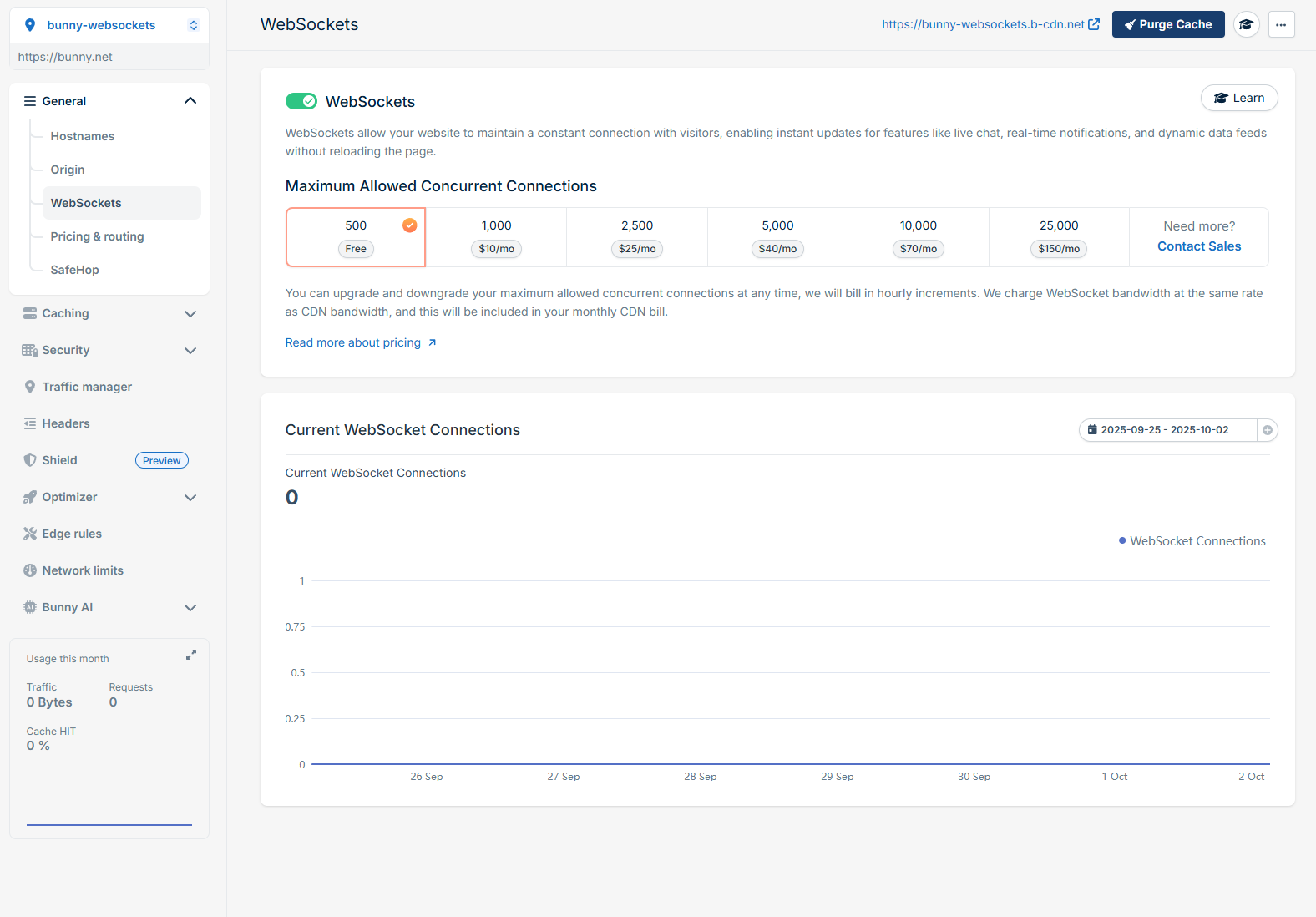 WebSockets are included with bunny.net and scale with your needs. You get 500 concurrent connections free on every zone. Higher limits are available via simple monthly upgrades:| Concurrent Connections | Monthly Price |