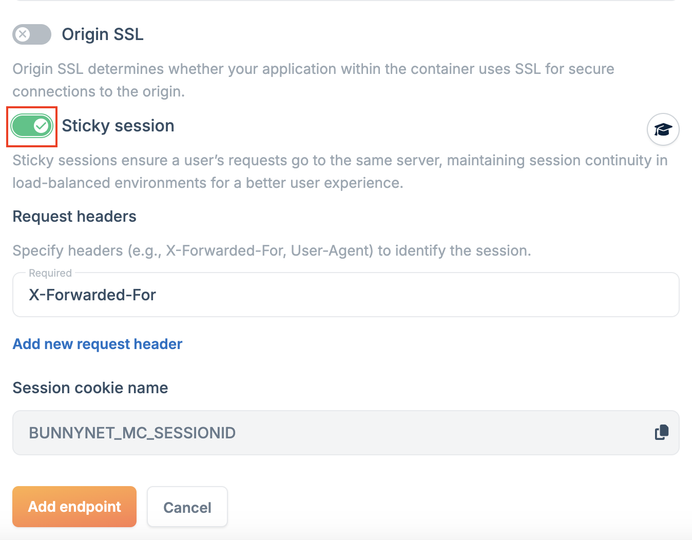 Sticky sessions ensure all requests from a client are routed to the same server instance, maintaining session state across requests. To enable sticky sessions:- In the endpoint configuration, select Sticky Session.