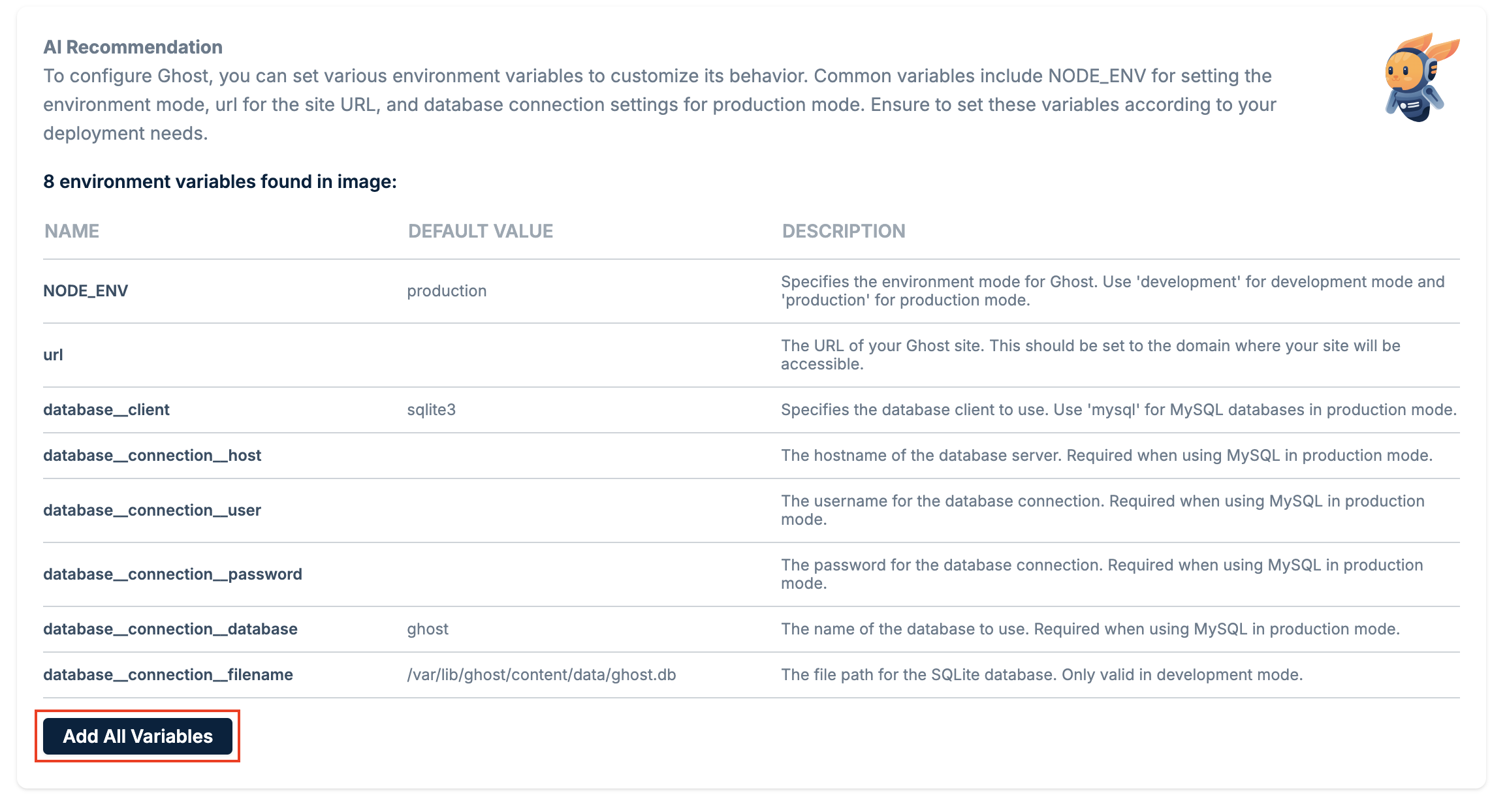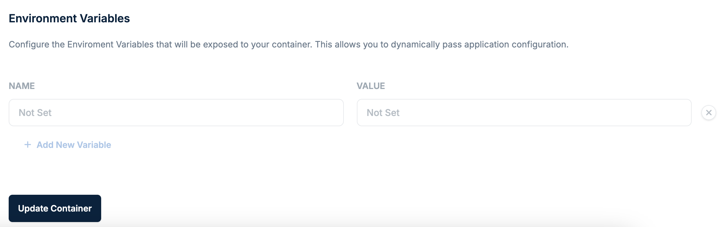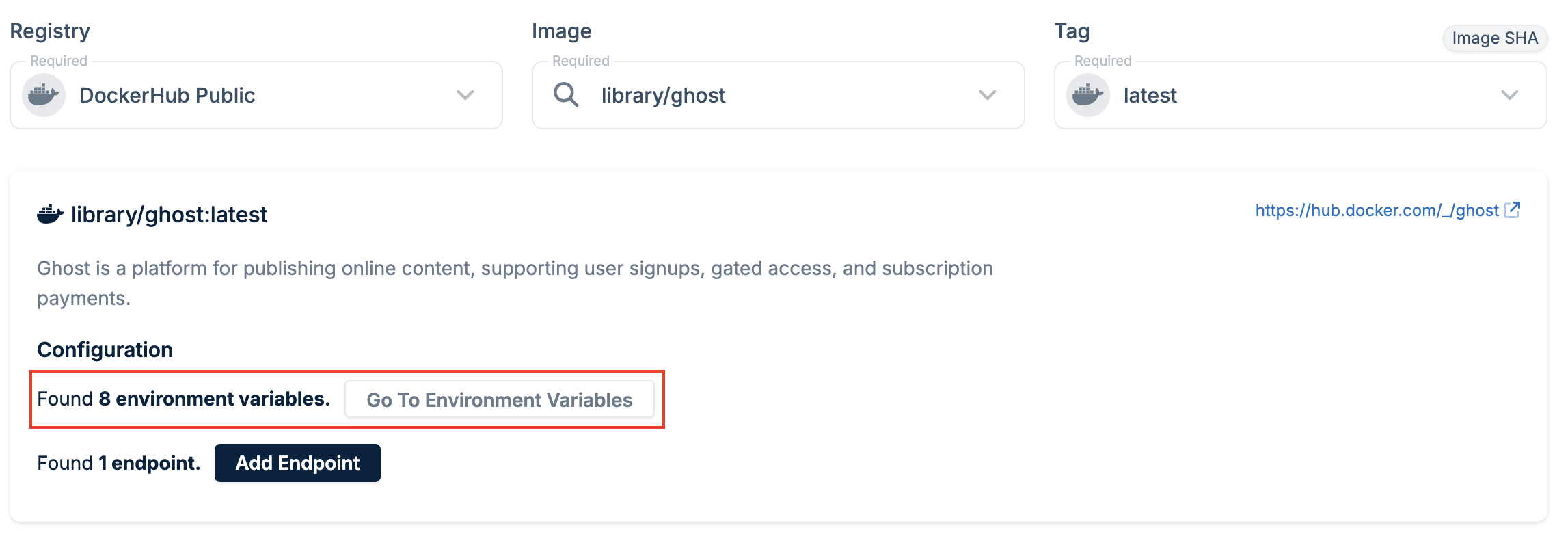 When you select a registry image, Magic Containers scans the image metadata to identify environment variables the container might use. If detected, the variables are displayed with their names and any default values.Automatic scanning is currently only supported for public Docker Hub images.
