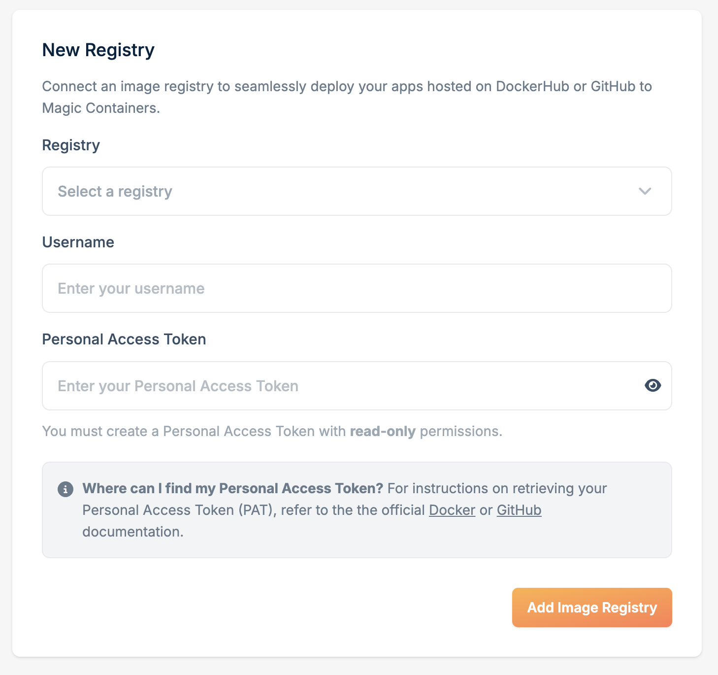 Public Docker Hub and GitHub container registries are already connected to Magic Containers. You can deploy any public image without additional configuration.Private registries