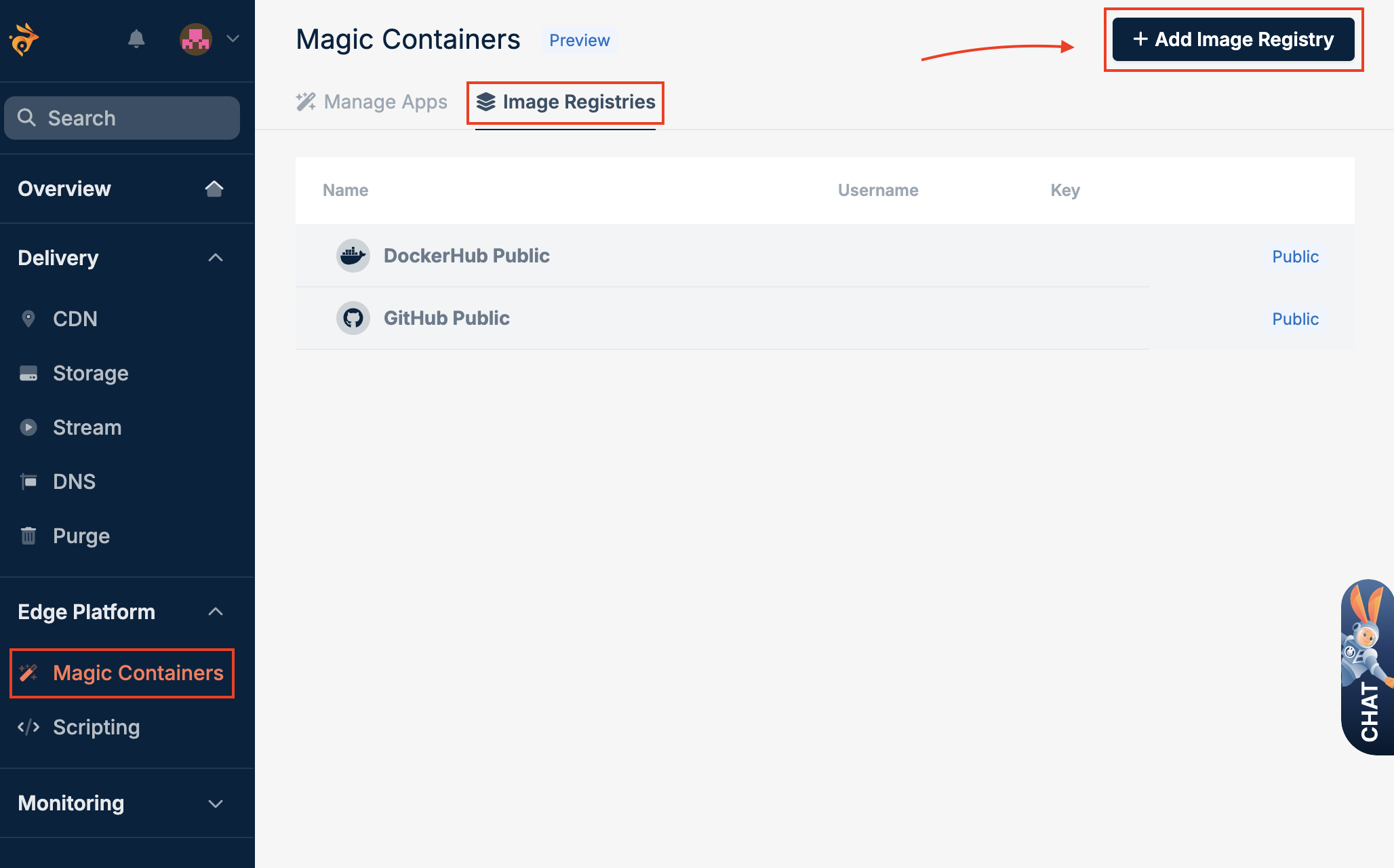 In the bunny.net dashboard, go to Magic Containers and select Image Registries.