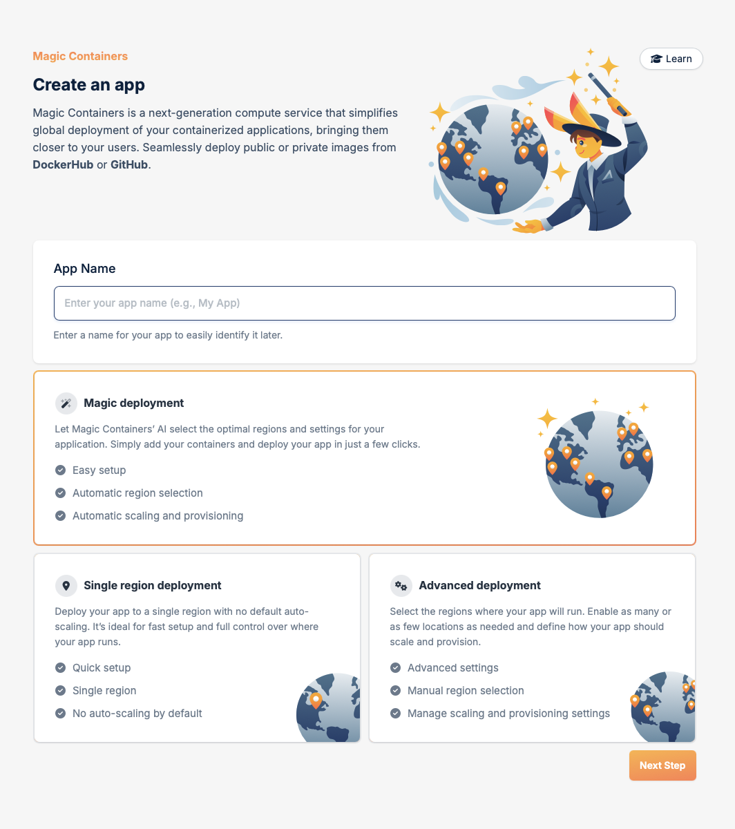 Define the name of your app and select the deployment option (Magic deployment, Single region deployment or Advanced deployment), then click Next Step.