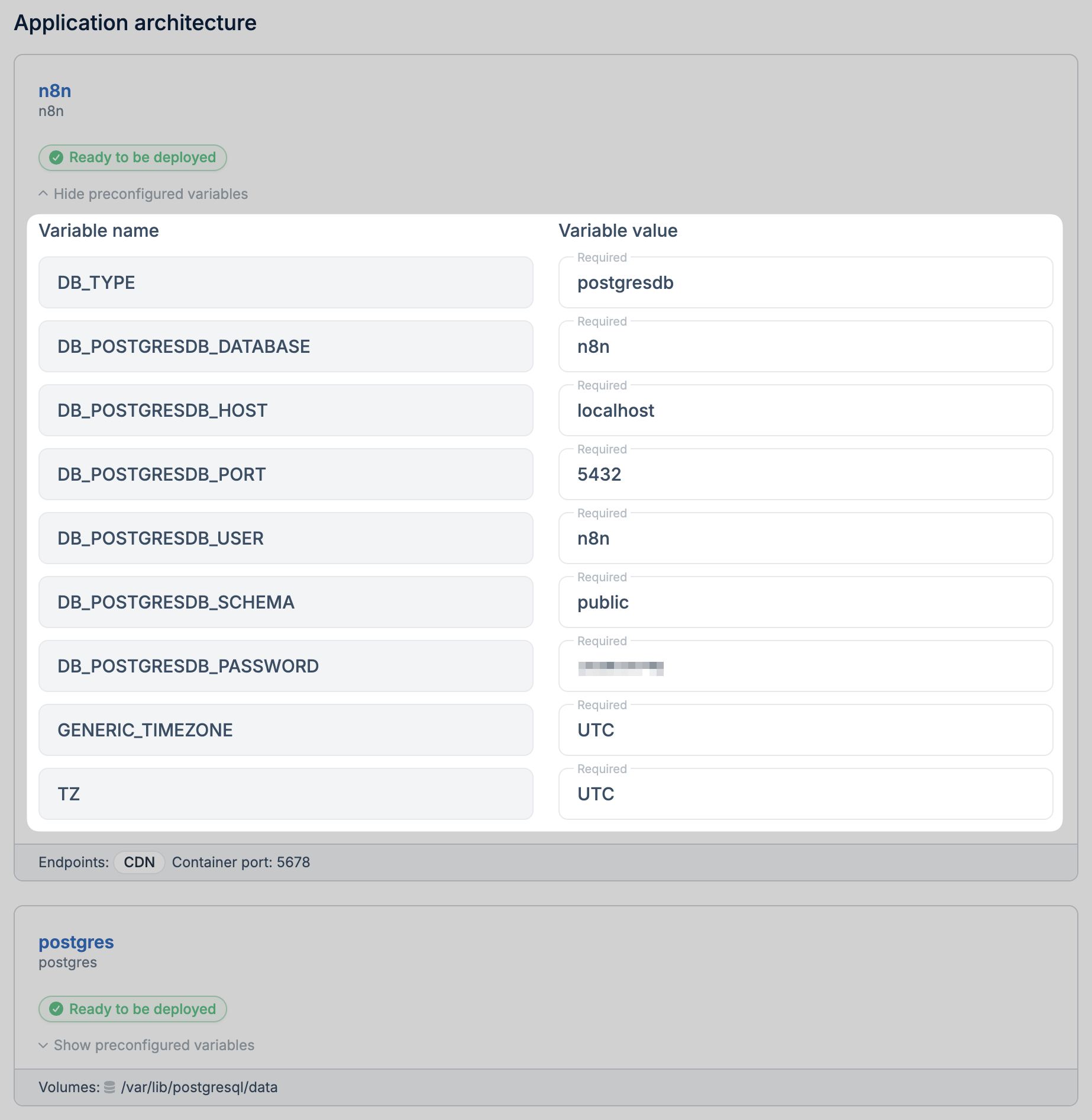 Some templates include configurable environment variables, such as database usernames and passwords. Update these values as needed before deploying.