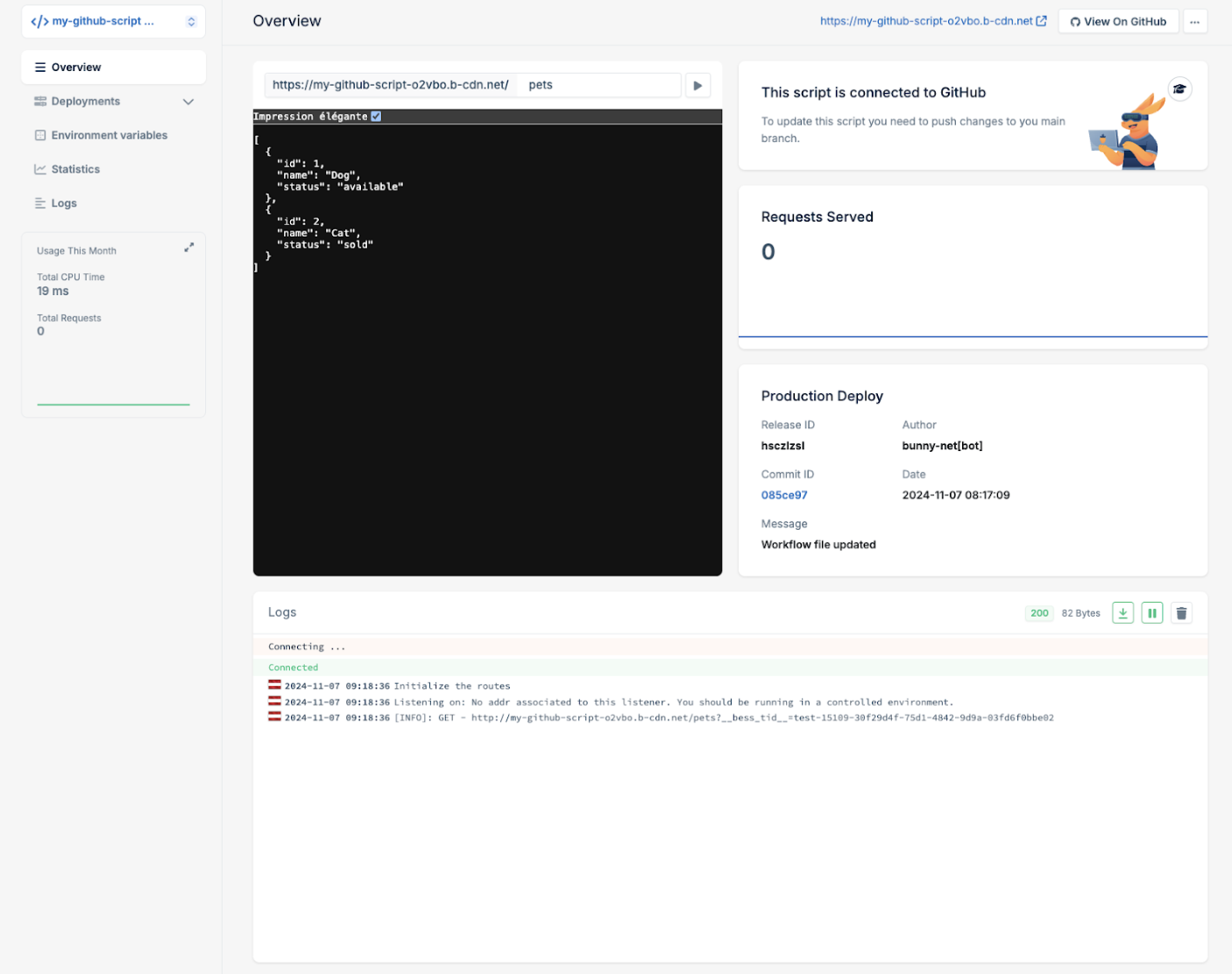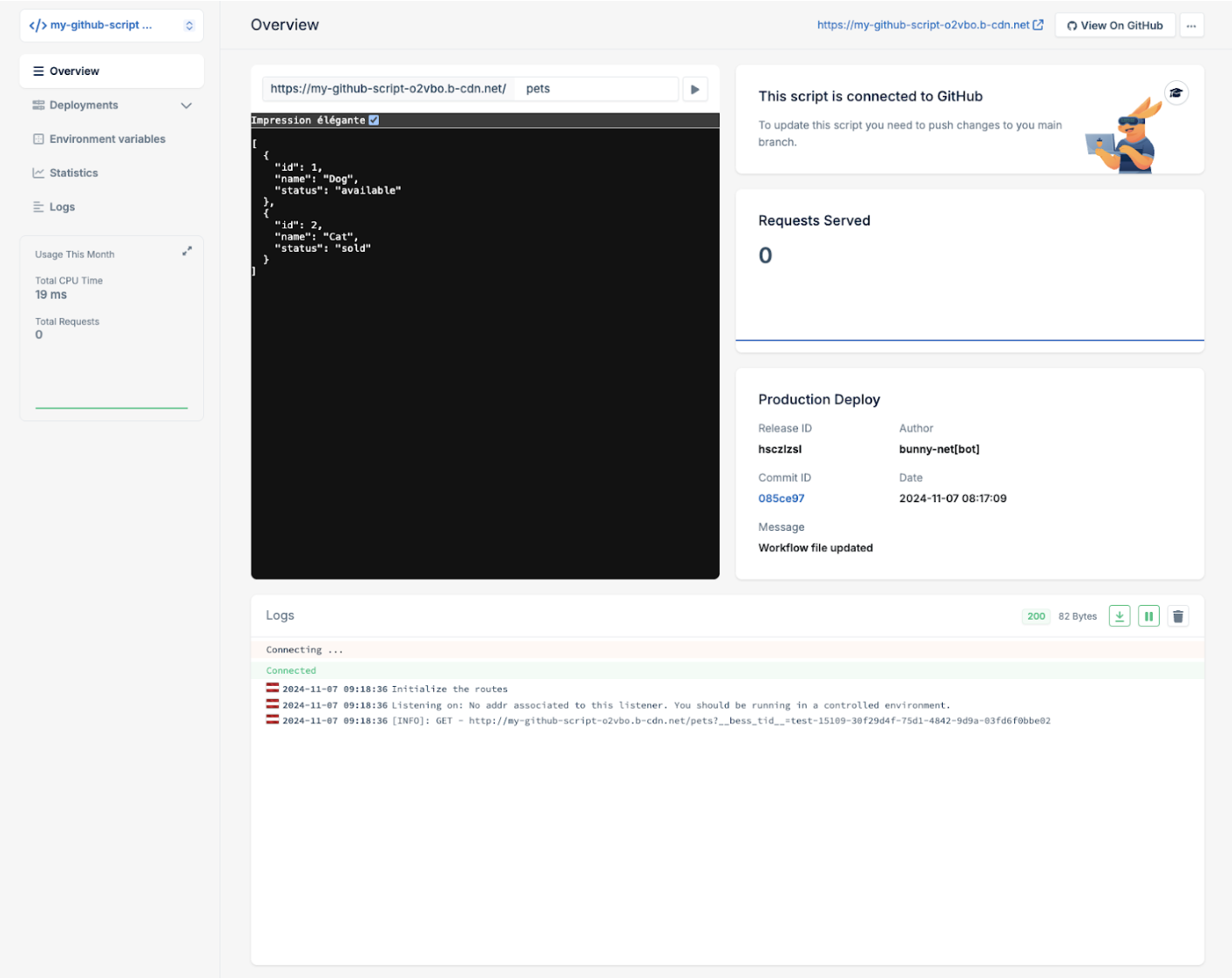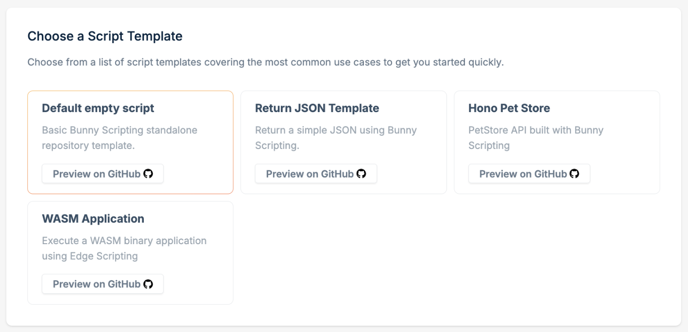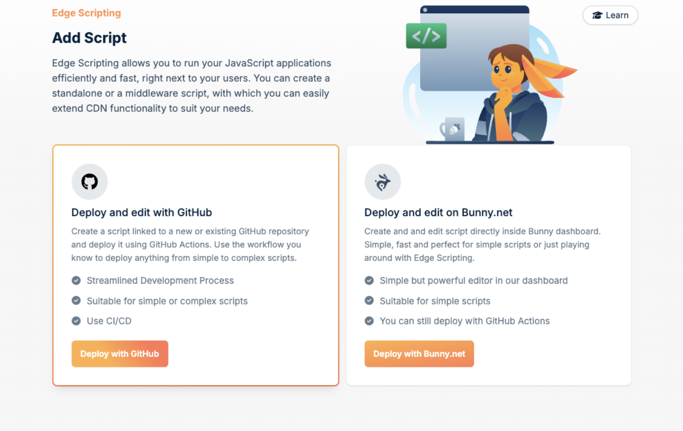 - This step of script creation allows you to choose between managing the code with Github and managing it in the dashboard. The Deploy and edit on Bunny.net option lets you start coding directly in the browser and is designed for simple scripts. Select Deploy and edit with GitHub to manage the code in a GitHub repository.