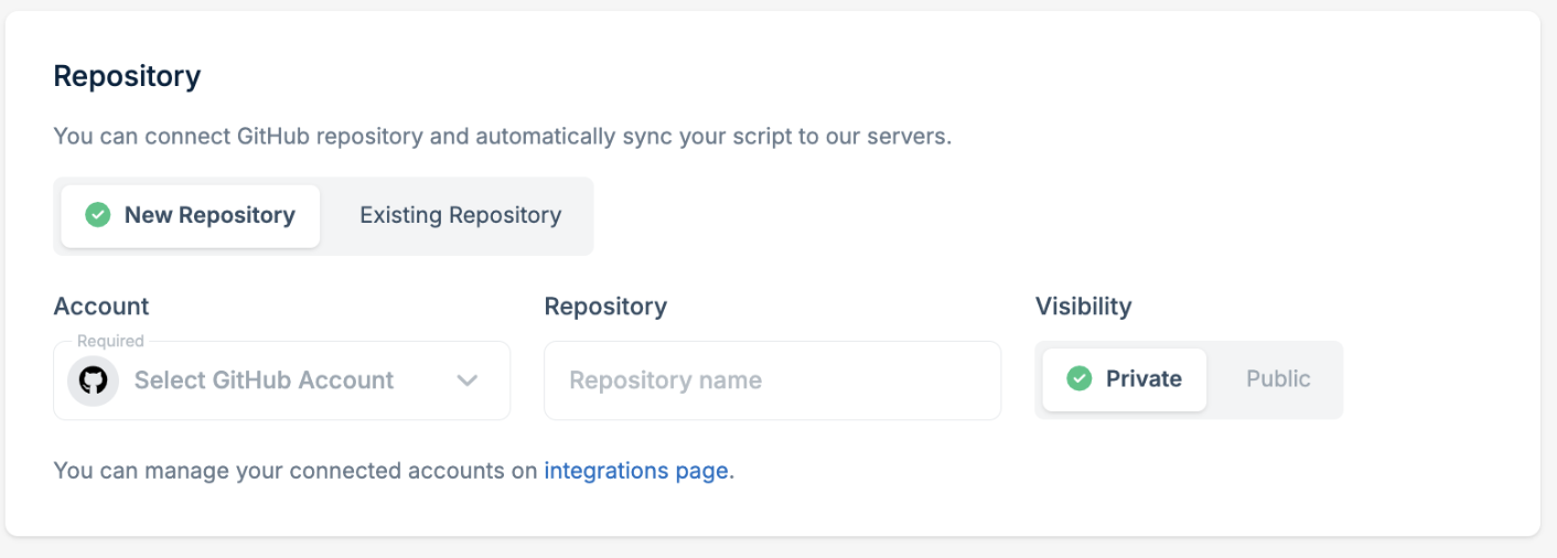 - Use the Repository section to connect the script with the GitHub repository. If you haven’t connected your GitHub account yet, click Connect GitHub Account.
