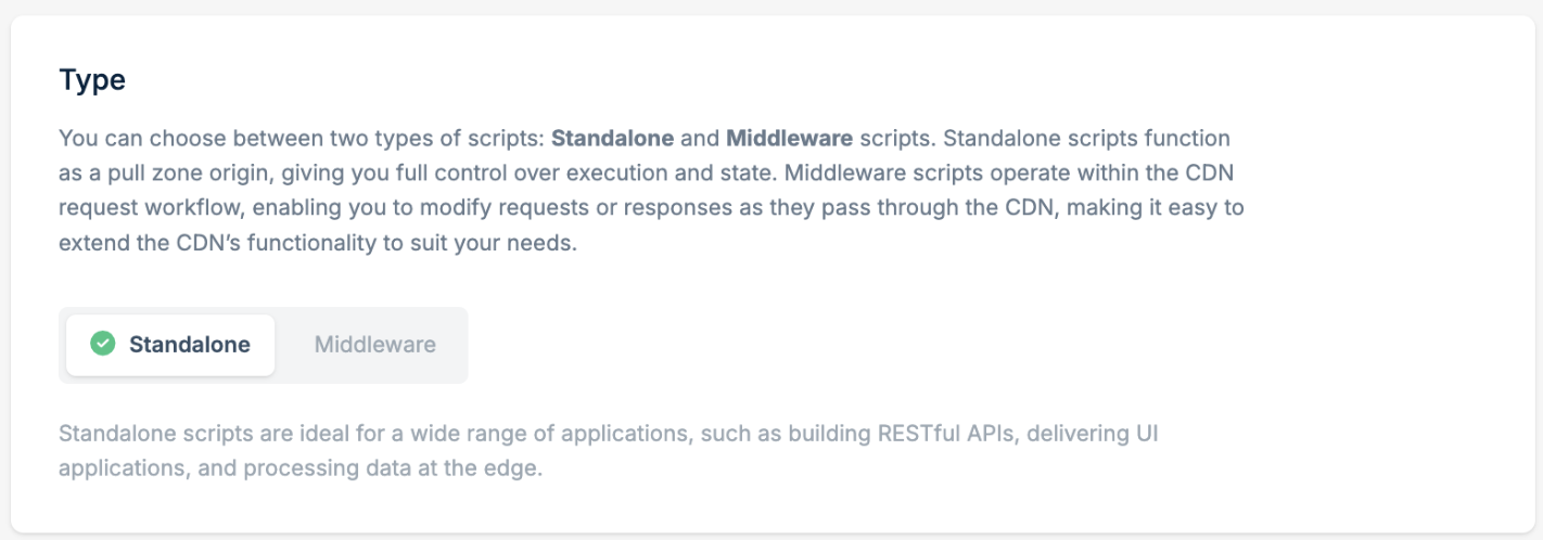 - Select between Standalone or Middleware script type. For more information, see our Script Types documentation.