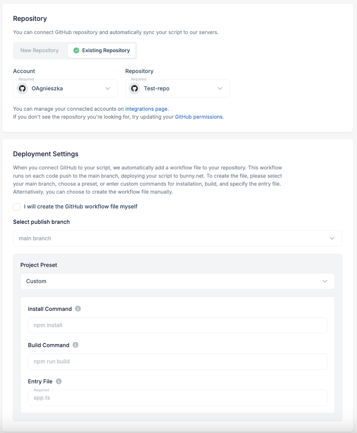 This option is suitable if you already have a project in JavaScript or TypeScript that is ready to be deployed to Edge Scripting. The repository should be compatible with bunny.net’s Edge Scripting, ideally using frameworks like Deno or Node.js. Your existing codebase should also be structured to integrate with the Edge Scripting deployment GitHub action. To integrate with an existing repository, the process is similar to setting up a new repository. Follow the steps outlined in the previous guide (Creating a new repository) up to Step 7. Once you have completed those steps, continue with the instructions below to finalize the integration with your existing repository:- Select Existing Repository.