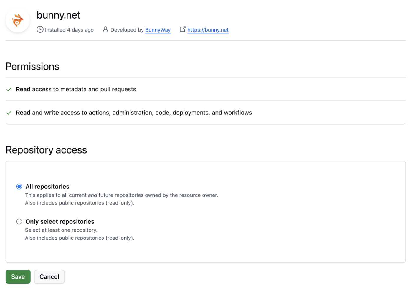 - You will be redirected to the GitHub application permission page, where you can select the repositories that bunny.net can access.