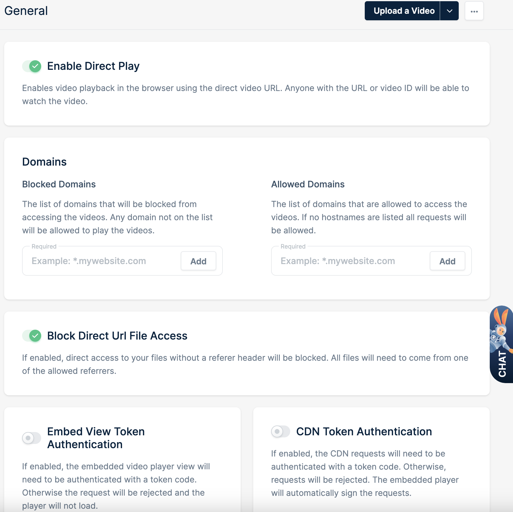 - Block Direct URL File Access -You can enable this setting to prevent direct access to your video files without a proper referer header. This measure blocks attempts to access and download your content directly via its URL, offering an additional layer of protection against unauthorized distribution.