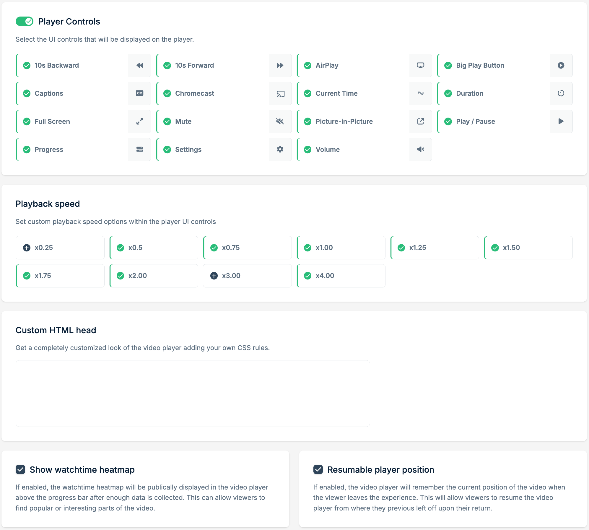 - Playback Speed - Set custom playback speed options within your video player, giving you flexibility for custom default playback speeds and additional options.