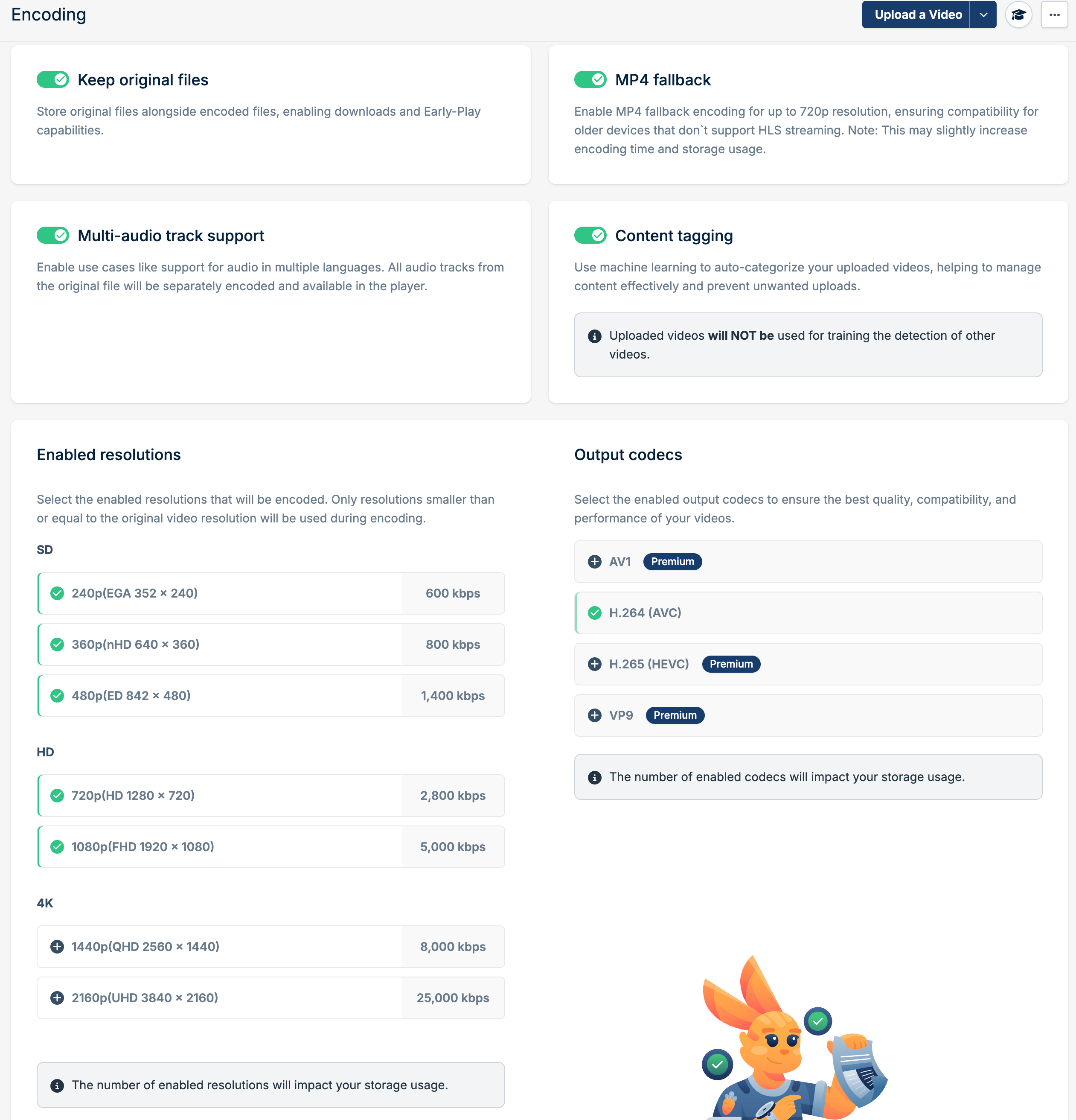 You may notice that once a video is uploaded, it consumes a larger amount of storage space than it is using on your local machine. This would be due to the encoding options that you’ve set under the Encoding Tab of your Video Library, you can find the options that increase the size below;MP4 Fallback Keep Original Files Enabled Resolutions
