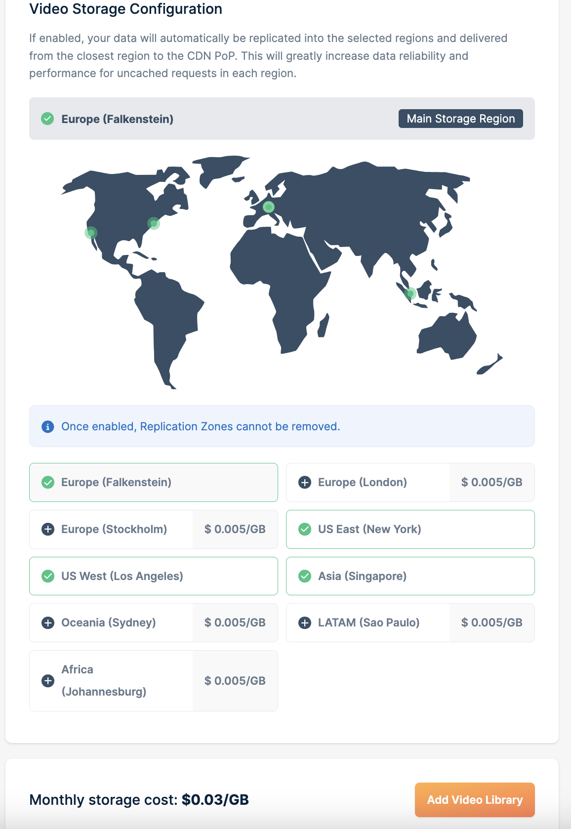- The next step is to set up your video storage configuration. We recommend enabling at least 2 regions to assure data durability in case of a local hardware failure in a single region. To achieve optimal performance, we recommend enabling at least one storage region per continent.