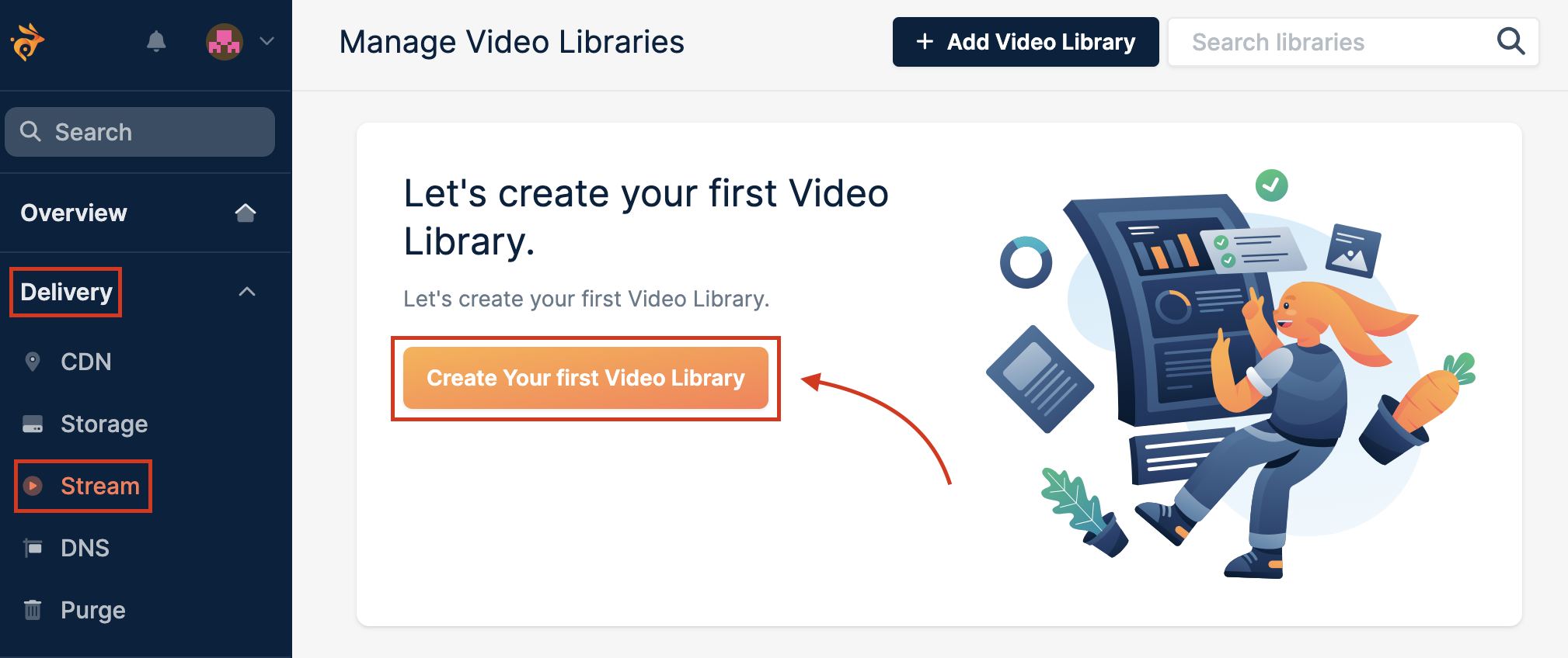 - Go to Delivery -> Stream and click Create Your first Video Library.