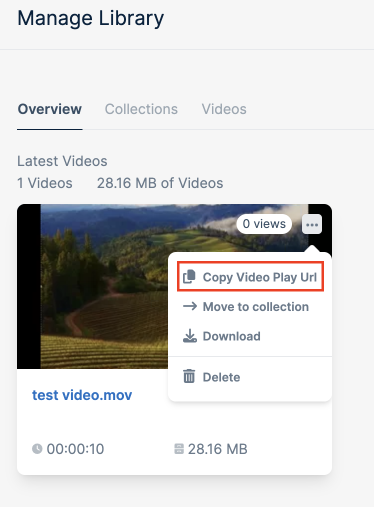 To get the URL of your video click on the video and select Copy Video Play Url.