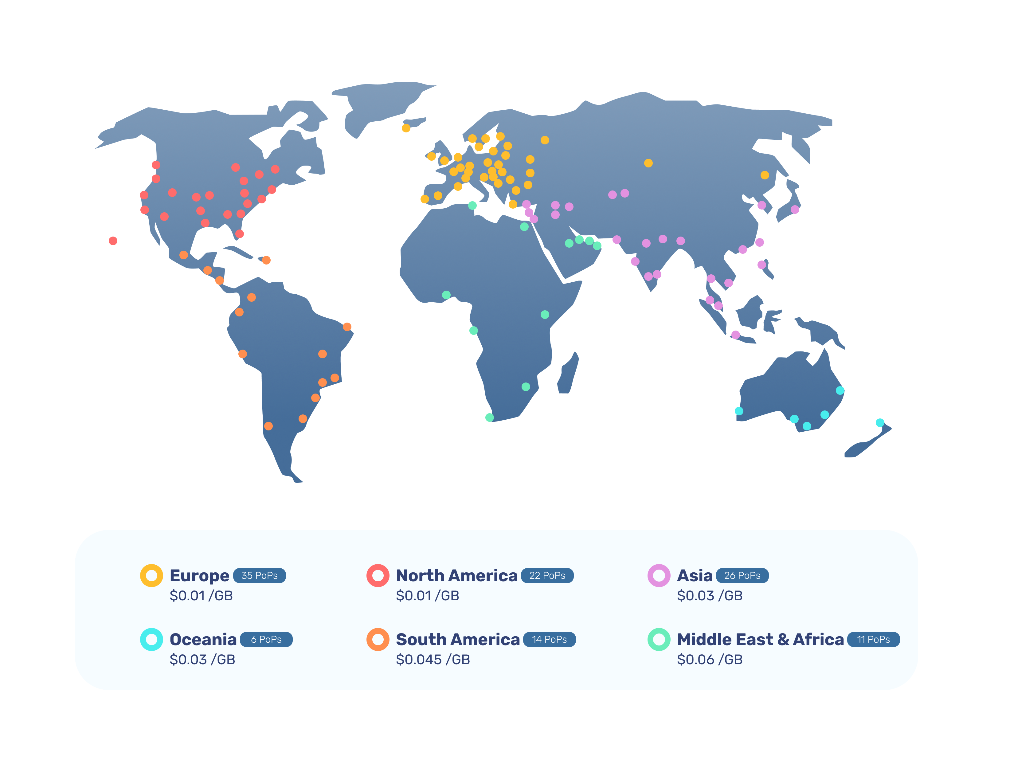 Standard tier offers exceptionally low global latency aimed at high-performance solutions where every millisecond matters, such as website acceleration or ad delivery. The Standard tier gives you access to the full Bunny.net network and is one of the best performing networks around the globe. We bill this tier based on the region you serve traffic in, please see the diagram below: